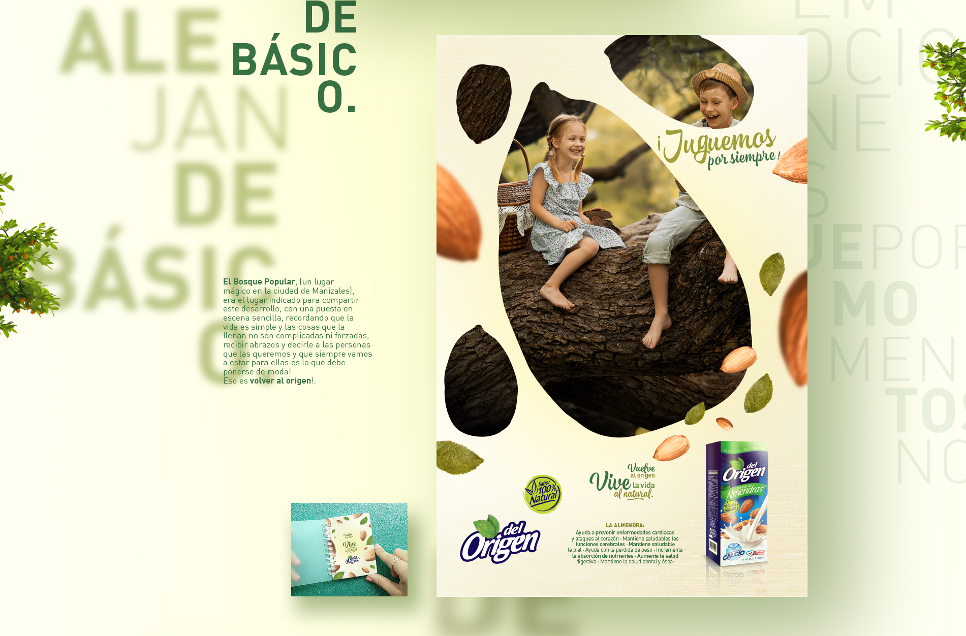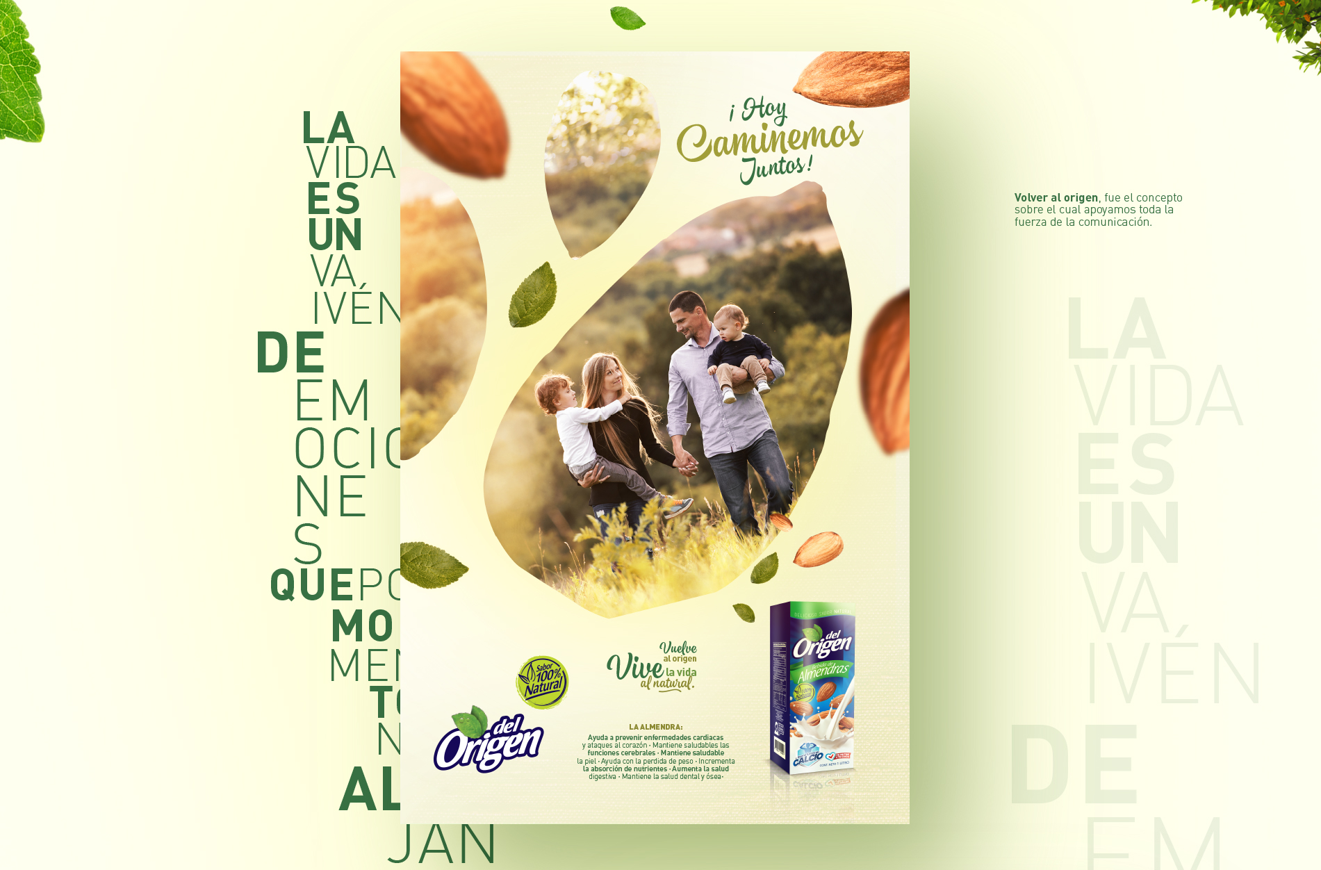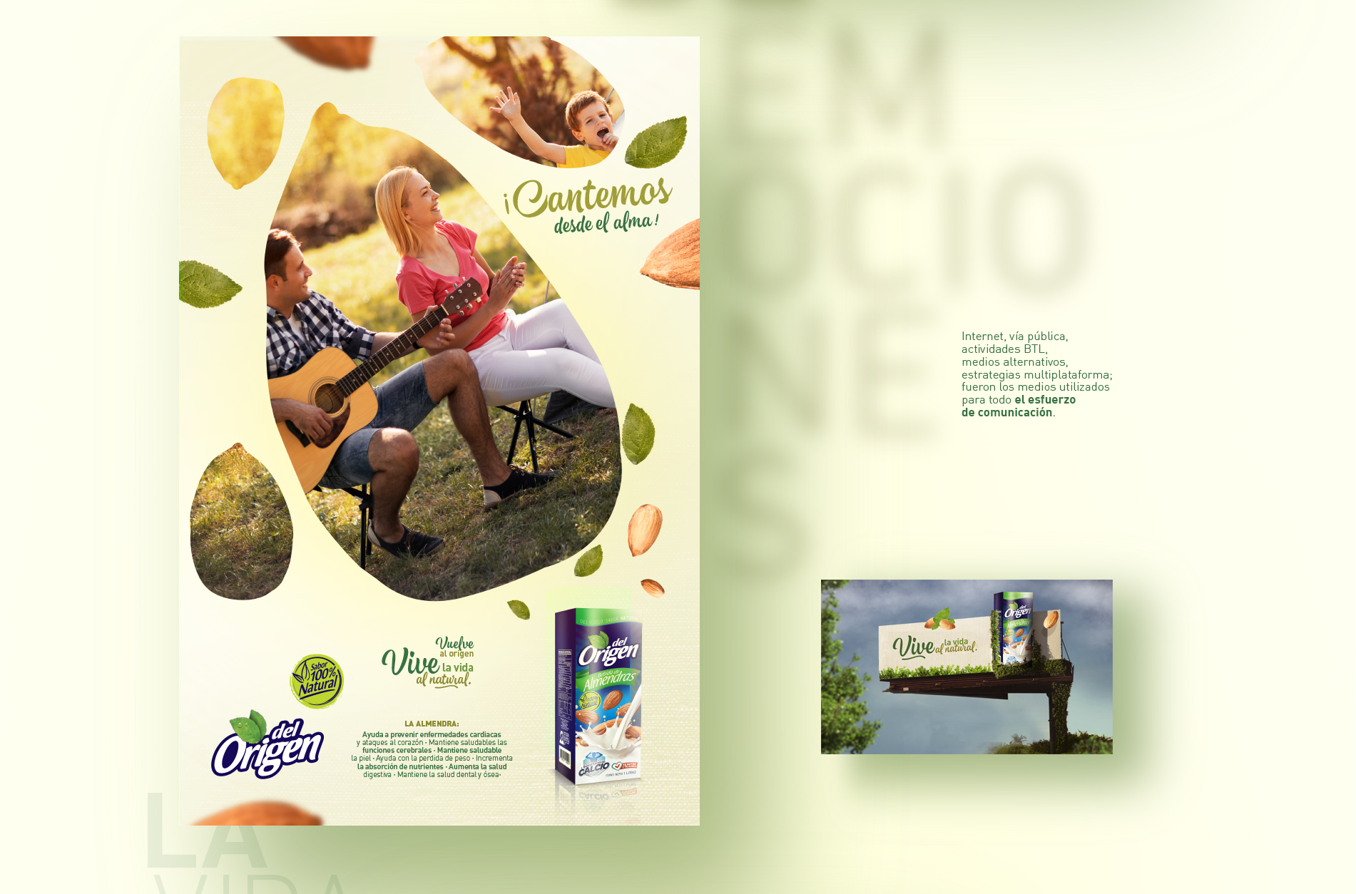Del Origen es la línea de productos especiales de la Organización Celema S.A., su director de mercadeo nos pidió trabajar esta campaña de lanzamiento de su nuevo producto de Almendras en un ejercicio 360°, el concepto “Vive la vida al natural” fue el eje de toda la comunicación, Vía pública, Tv, Redes, medios impresos, incluso libro alusivo a como llevar una vida sana y a rescatar lo realmente importante en la vida, lo simple, el origen, la vida al natural. Aquí el desarrollo de la campaña